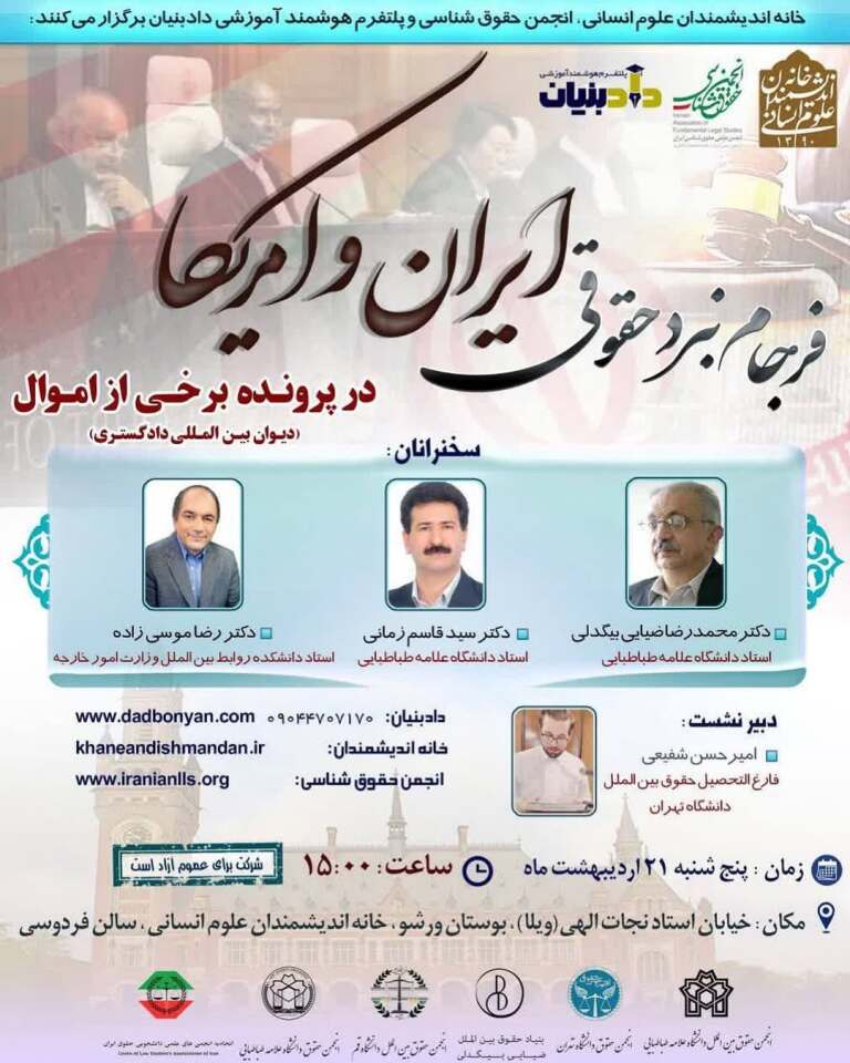 به نقل از پایگاه اطلاع رسانی خبرقانون پلتفرم آموزشی حقوقی دادبنیان در سال ۱۴۰۲، دورهای تخصصی با عنوان «نبرد حقوقی ایران و آمریکا در پرونده برخی از اموال» برگزار کرد. این دوره با همکاری مجموعهای از نهادهای علمی و حقوقی کشور از جمله دانشگاه تهران، انجمن حقوق بینالملل دانشگاه علامه طباطبایی، انجمن علمی دانشگاه قم، آکادمی حقوق بینالملل بیگدلی، خانه اندیشمندان علوم انسانی و سایر سازمانهای مرتبط به اجرا درآمد.