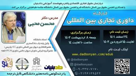 برگزاری کارگاه داوری تجاری بین المللی با همکاری انجمن علمی حقوق بین الملل دانشگاه قم و انجمن حقوق بین الملل دانشگاه علامه طباطبایی در تاریخ ۲۴ اسفندماه ۱۴۰۱ ثبت نام شد و در تاریخ ۸ اردیبهشت ماه سال ۱۴۰۲ به دلیل استقبال فراوان با تاخیر برگزار شد. این دوره از کاربردی ترین دوره های حقوقی بوده است که دادبنیان برگزار کرده است و به جرات میتوان این دوره را از اثرگذارترین کارگاه های حقوقی دانست.